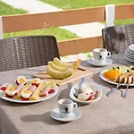 ארוחת הבוקר מוגשת במסעדה. יש בר חטיפים זמין.